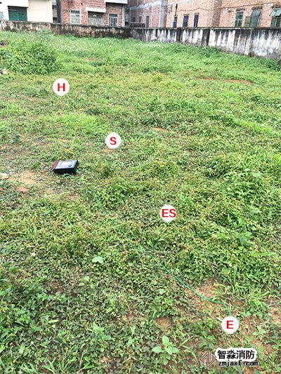 把接地棒打到土壤下,線上有鉗子的一端鉗住接地棒,還要再打三根接地棒。共:紅,黃,綠,黑四根線。接地線的按照H,S,ES,E順序成一直線排列,每個接地棒之間距離為5米