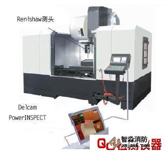 傳統的零件測量方法常常采用離線測量。需把被測零件從加工設備轉移到測量設備上,有時在一個加工過程中甚至需要幾個來回,使檢測工件的費用,超過了工件的加工費用。因此通過使用在線測量來代替離線測量,使得在線檢測的效率和精確度得到保證的條件下,使質量檢測過程更靠近加工過程,從而保證了工件從加工設備上卸下的時候就是合格品。本文介紹的基于Renishaw和Delcam的加工中心在線檢測是通過為加工中心配備一個Renishaw測頭以及PowerINSPECT在線檢測軟件,構成加工中心在線檢測系統,如圖1所示。
